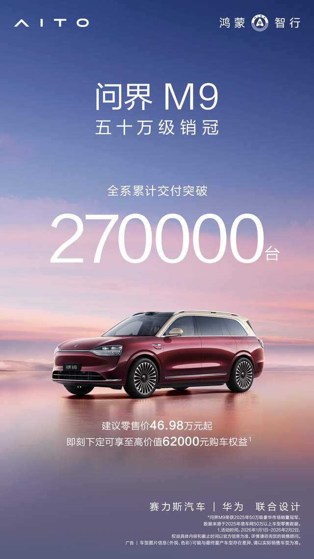 随着问界品牌迈入百万辆规模,问界M9将持续通过OTA升级优化产品体验,以真实交付、透明服务与稳定品质,巩固高端市场领先优势,推动中国高端汽车品牌持续向上突破。