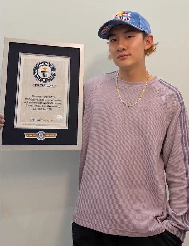 近日,苏翊鸣在今年10月7日完成的“背靠背1980”动作获得了吉尼斯世界纪录的官方认证,确认他创造了“一次连贯滑行内完成单板滑雪1980度转体次数最多”的吉尼斯世界纪录。