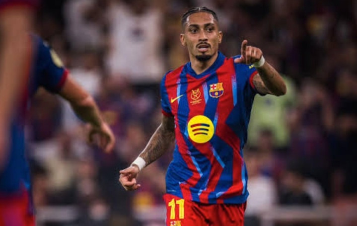 上半场伤停补时阶段,佩德里接应突入被马克普维尔绊倒制造点球,第45+5分钟,拉菲尼亚主罚点球低射命中,巴萨主场2-0领先,总比分2-4落后。