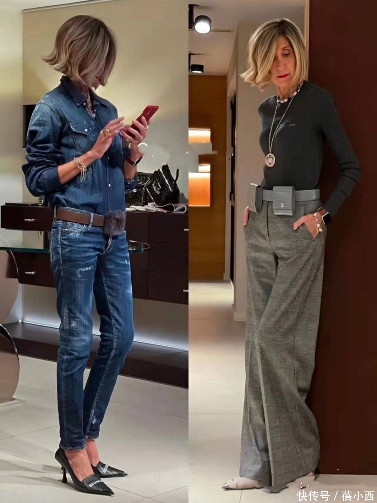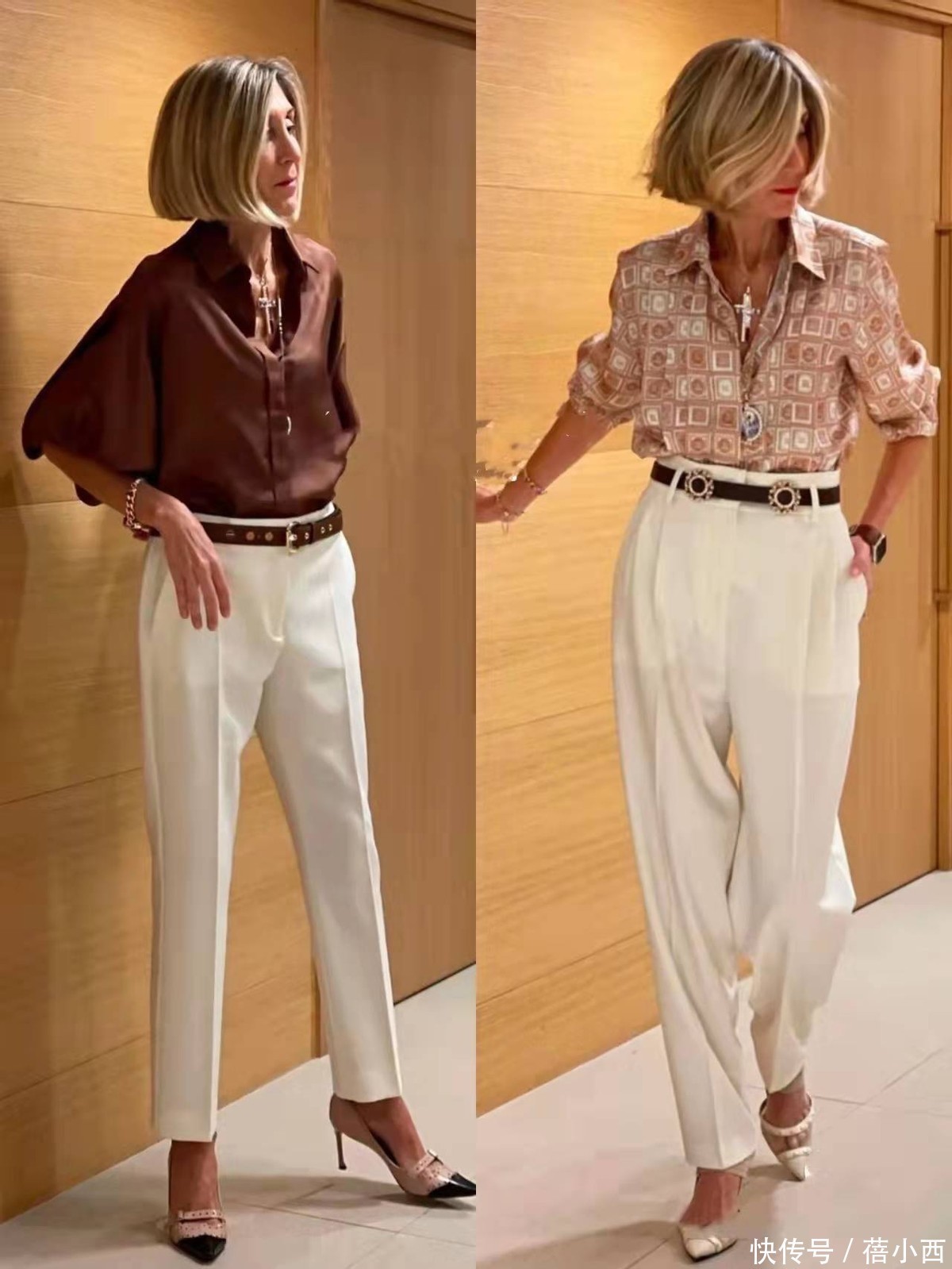 质感好是这个博主穿搭中最值得学习的一点,她深知,到了这个年纪,面料的好坏一眼便知。因此,她宁愿少买几件,也要投资一些面料上乘的单品:一件羊绒衫的软糯亲肤,一条真丝衬衫流露的光泽感,一件羊毛西装外套拥有挺括的筋骨。这些优质面料自带高级属性,即使设计简单,也能让穿着者散发出“这衣服不便宜”的含蓄贵气,气质出众。