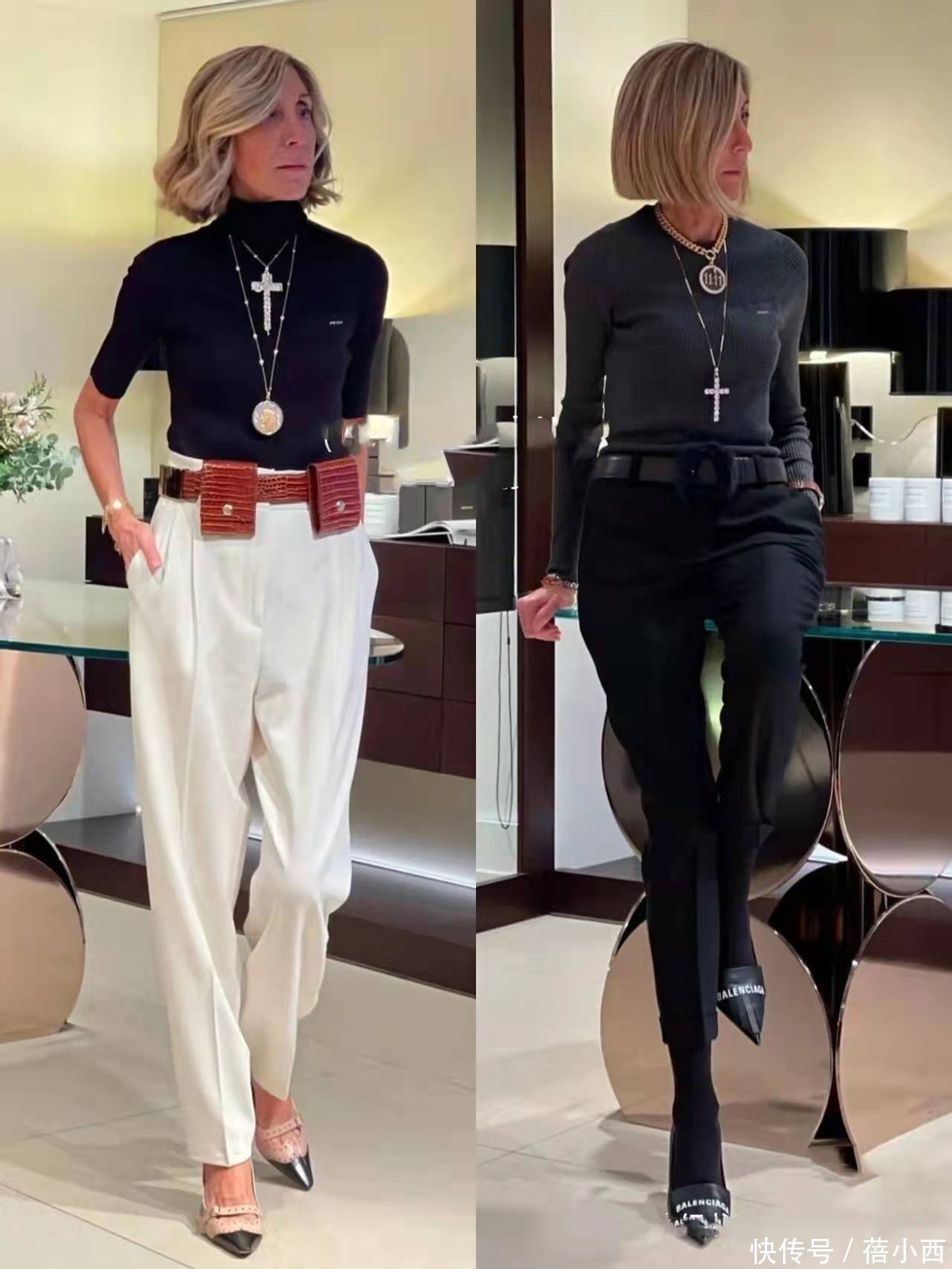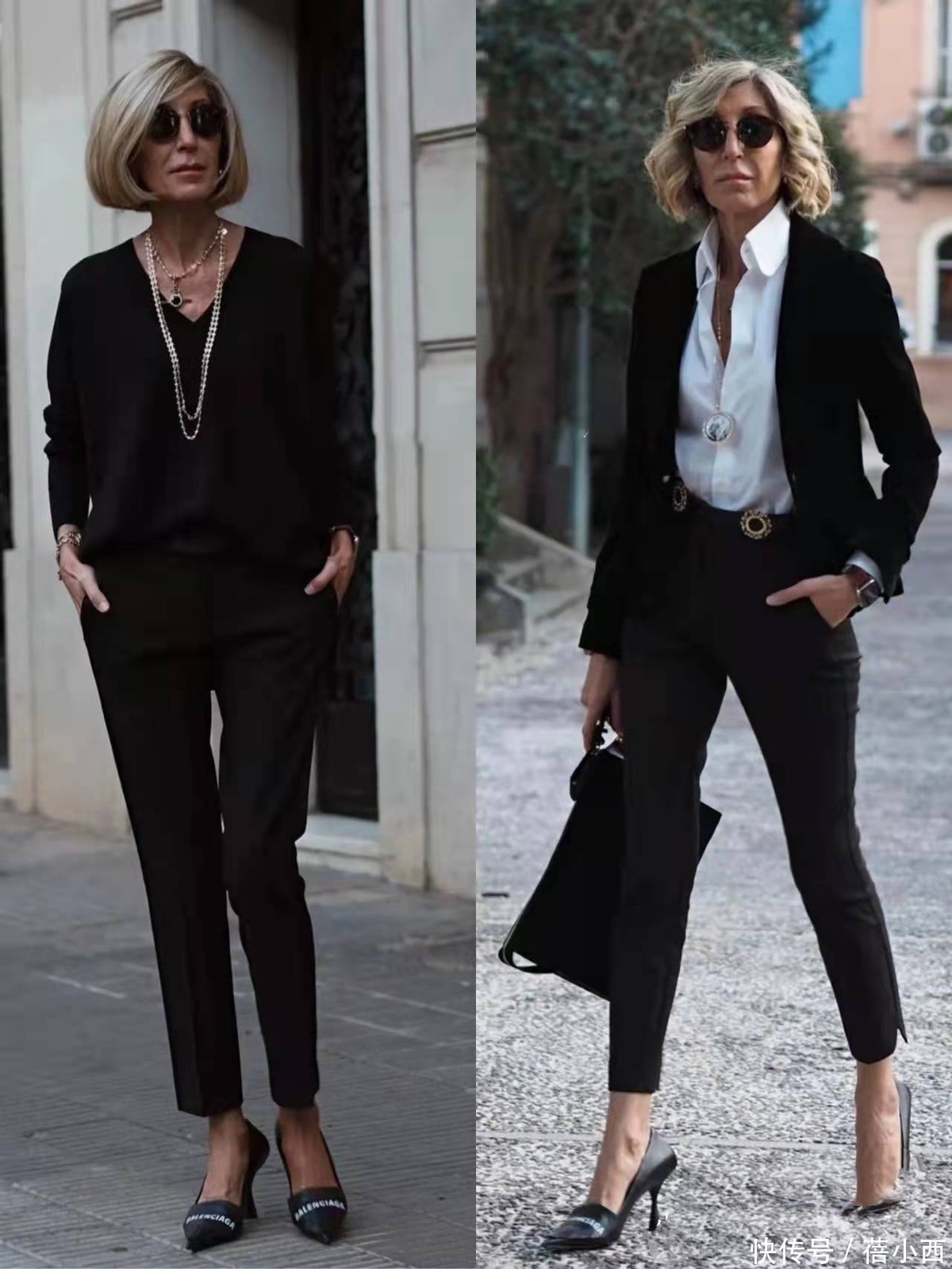 这个五十岁的姐姐很少穿鲜艳刺眼的颜色,她的穿搭主色调是黑、白、灰、米、驼、藏蓝这些经典的中性色。这些颜色自带高级滤镜,相互之间搭配和谐,几乎不会出错。比如黑白灰三色之间的组合,全身都是柔和的色调,绝不喧宾夺主。