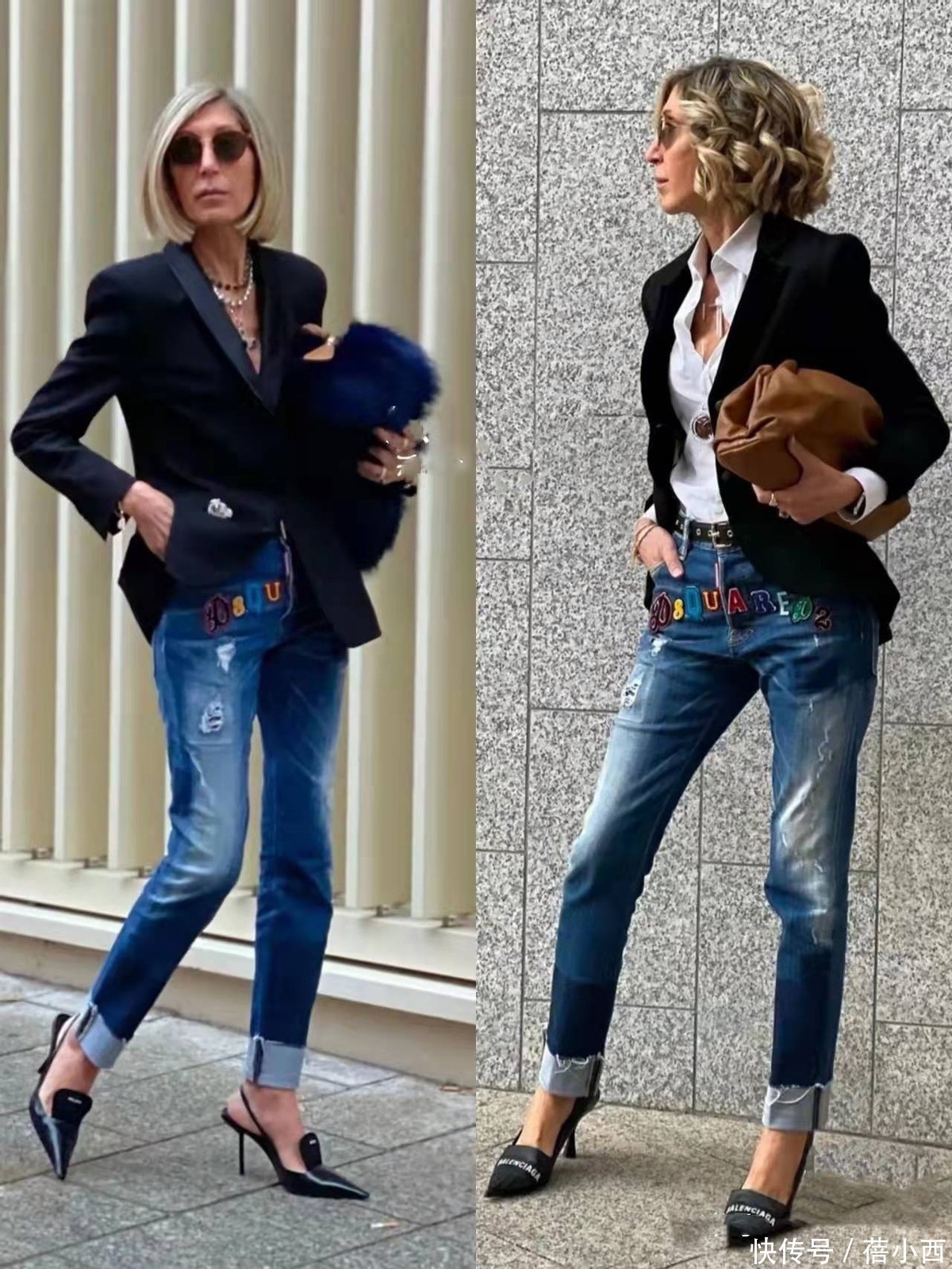 就拿她的通勤搭配来说,经典的黑色西装搭配白衬衫,这种简约利落的单品组合显得非常干练大方,下半身搭配修身的牛仔裤,中和了西装外套的严肃,时尚度拉满。这一套基础款搭配之所以时髦,就是因为风格有对比,没有按照常规的套路搭配,打破了单调感。